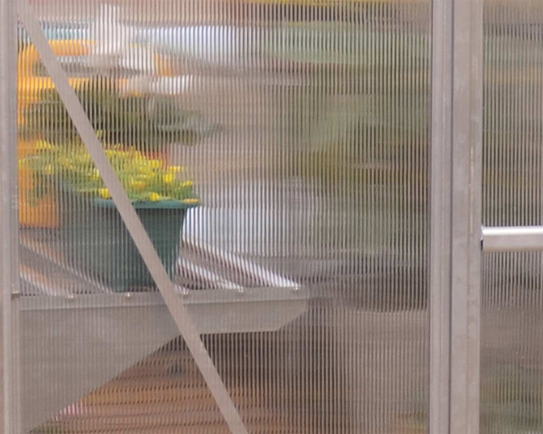 - Resilient Polycarbonate Panels: Virtually unbreakable 6 mm wall and roof and 4mm door and window twin-wall polycarbonate panels maintain ideal temperatures and protect from strong sunlight exposure.