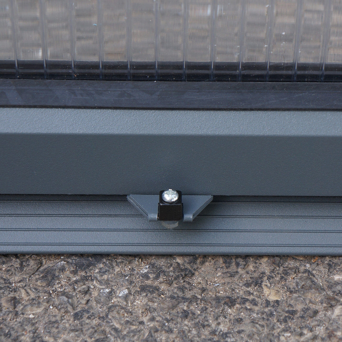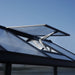 - Includes a roof vent with automatic vent opener, side louver window, plant hangers, integrated rain gutters, threshold ramp, galvanized steel base, and a ground anchoring system