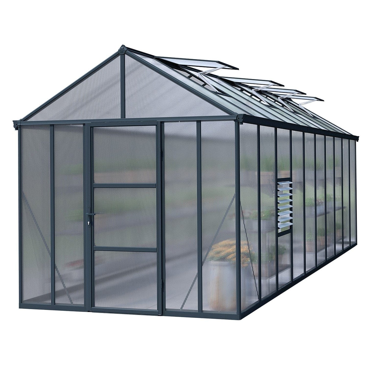 The Glory premium class greenhouse is the right answer for the year around gardening enthusiasts. The strong and robust gray powder-coated aluminum frame and 10mm thick polycarbonate panels make this a professional grade greenhouse that can be heated and/or cooled for year-round usage. The side louver window and roof vent allow proper airflow for the ideal temperature to keep plants healthy. The heavy-duty door is over 31 inches wide and can be locked. The door threshold allows easy access for wheelchairs or wheelbarrows. The gutter system will allow you to collect fresh rainwater for your plants. With sidewalls over 6' tall and a peak of almost 9' you can trellis your tall and leafy plants or over-winter your small trees. If you are serious about growing, this is your greenhouse.