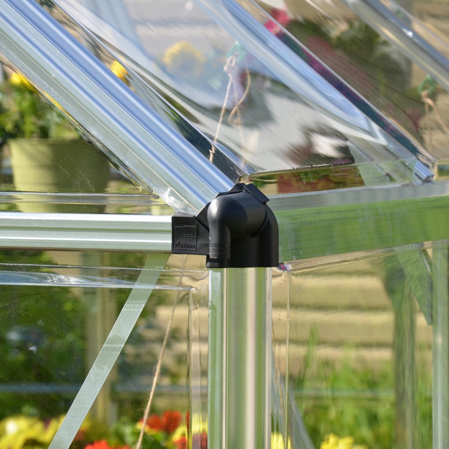 - Crystal clear virtually unbreakable polycarbonate roof and walls panels that provide 100% UV protection and over 90% light transmission directly onto plants