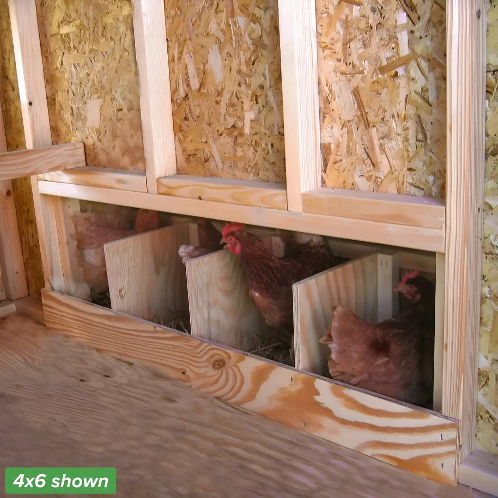 - 4×6: (4) nesting bins with egg laying area for 8 to 12 hens